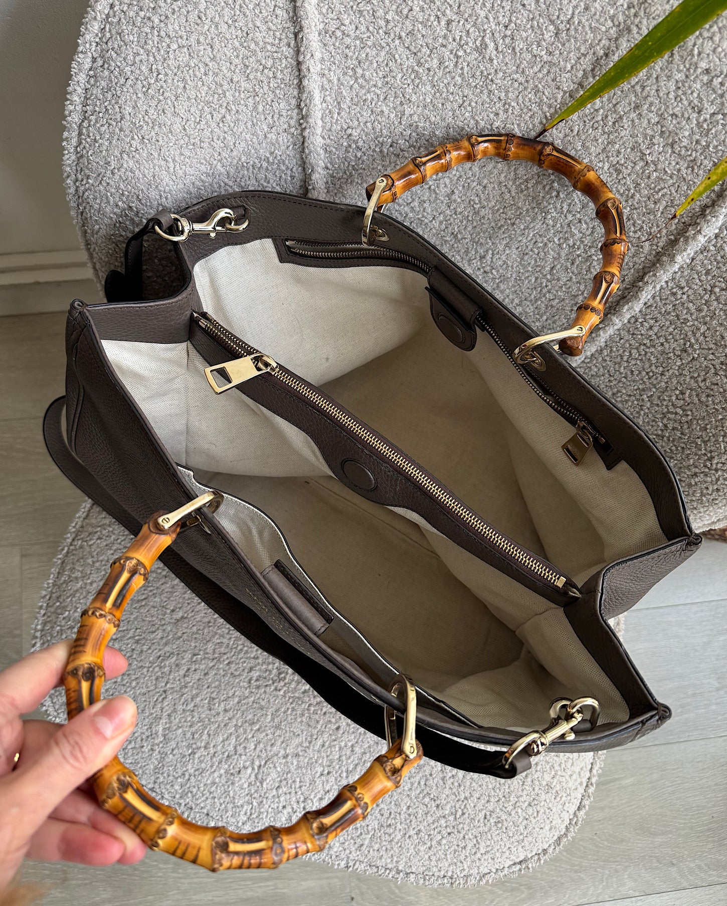 A beautiful brown grained leather tote with bamboo handles by Gucci. In great condition and a style steal at £650! Comes with a detachable long strap and a it’s dust bag. A timeless classic! The cream fabric lining is clean and there are lots of zipped compartments inside the bag.