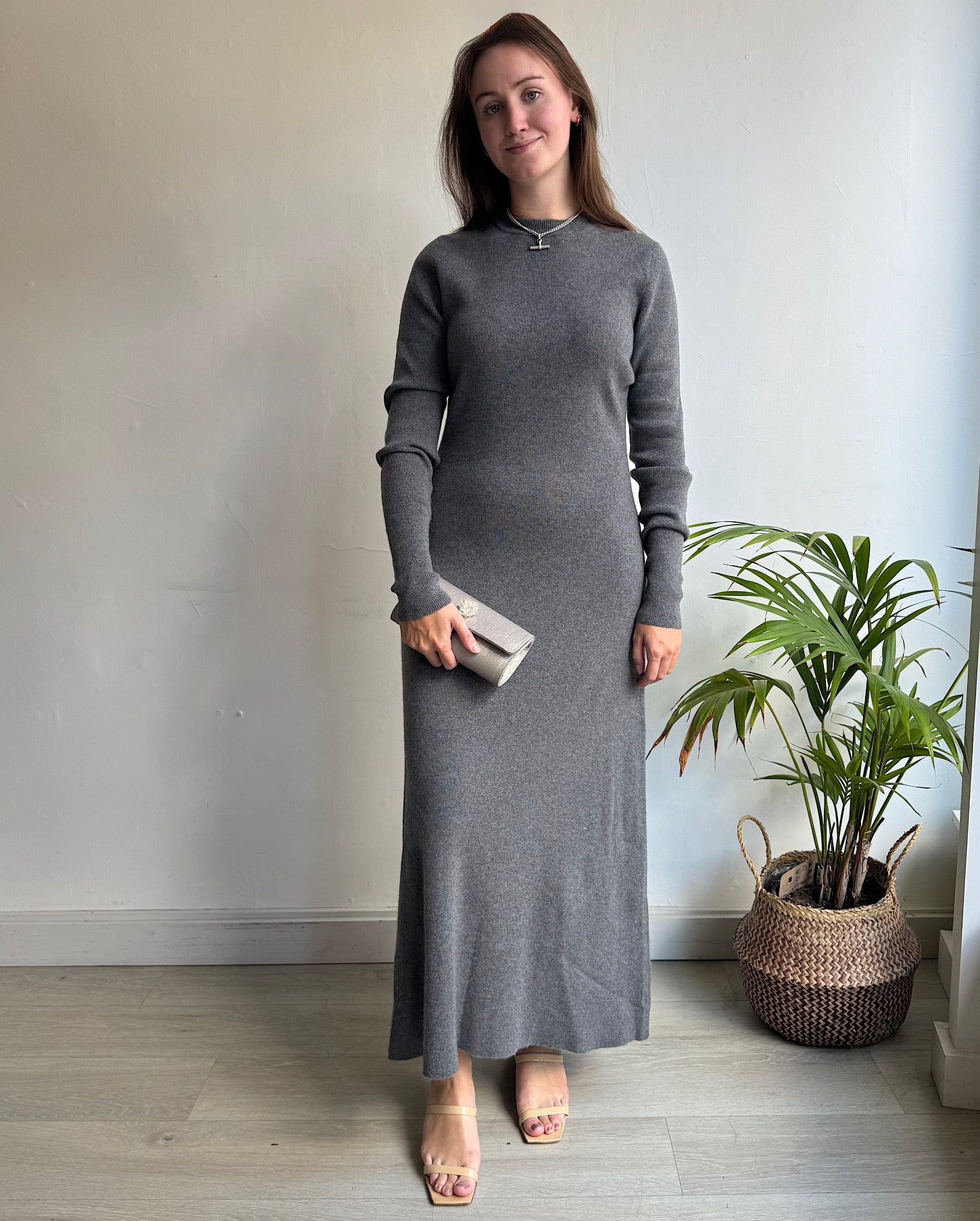 A stylish grey knitted cashmere maxi dress by RAEY. Size L and a style steal at £215! The front hem is slightly higher than the back. The dress looks great worn with heels in the evening or dressed down with chunky boots in the day time.