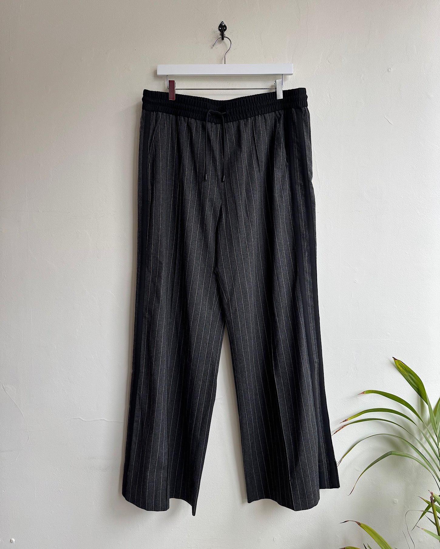 A stylish pair of charcoal pinstripe trousers by Me and Em. Size 16, new with tags and a style steal at £120! Originally retailed at £195! Features a black elasticated and drawstring waistband, wide leg, black double side stripe and pockets. The trousers look great worn casually with trainers and a jumper or styled with the matching sHirt and jacket that we are also selling.