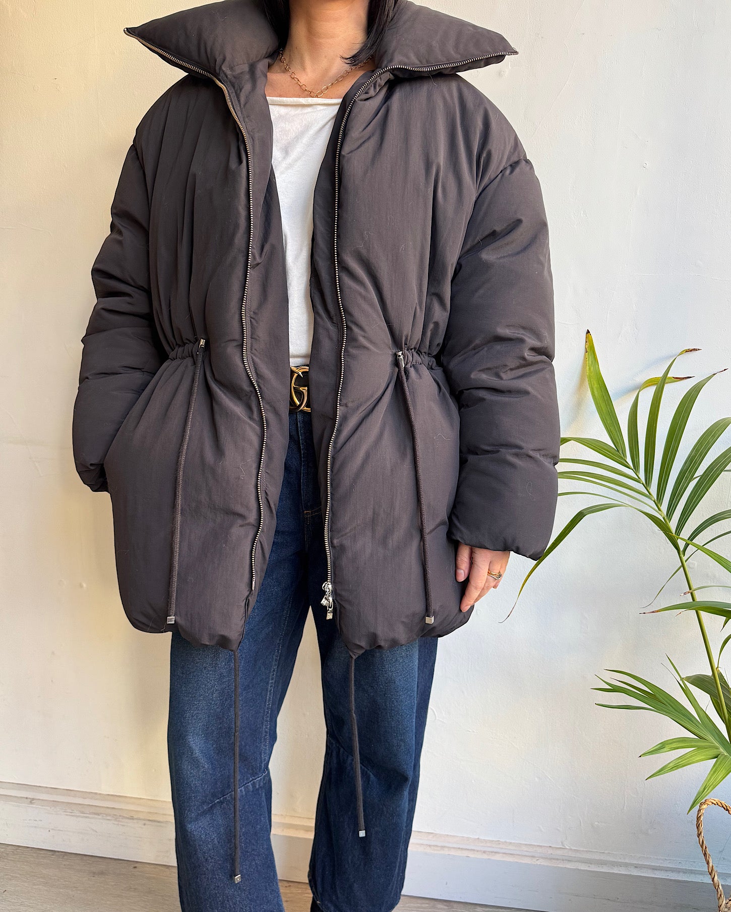 A stylish black drawstring down jacket from Toteme. An oversized 34 FR / 6 UK but it fits a size 10 UK. A style steal at £450! Originally retailed at £720! Features a zip fastening, drawstring waist and pockets.