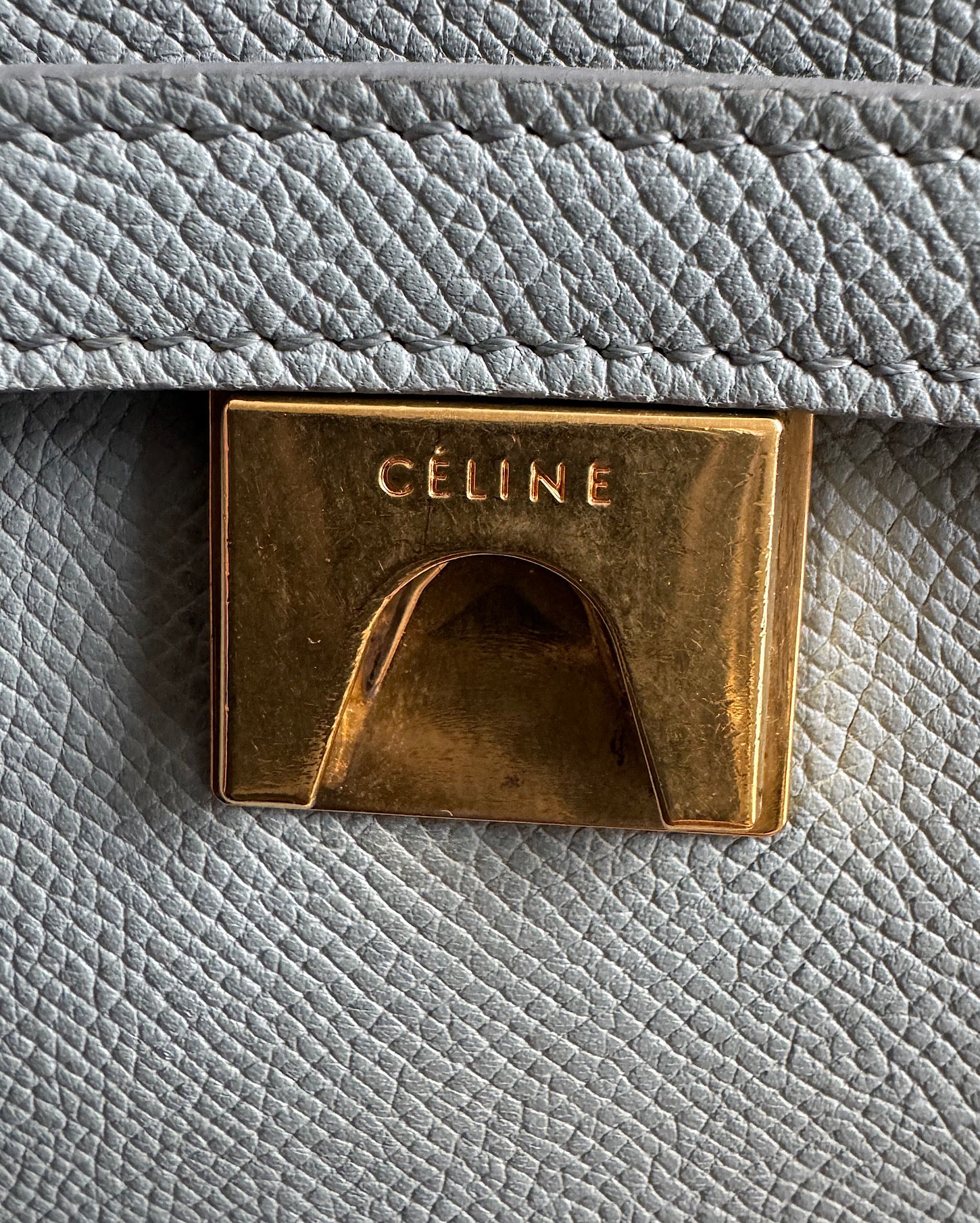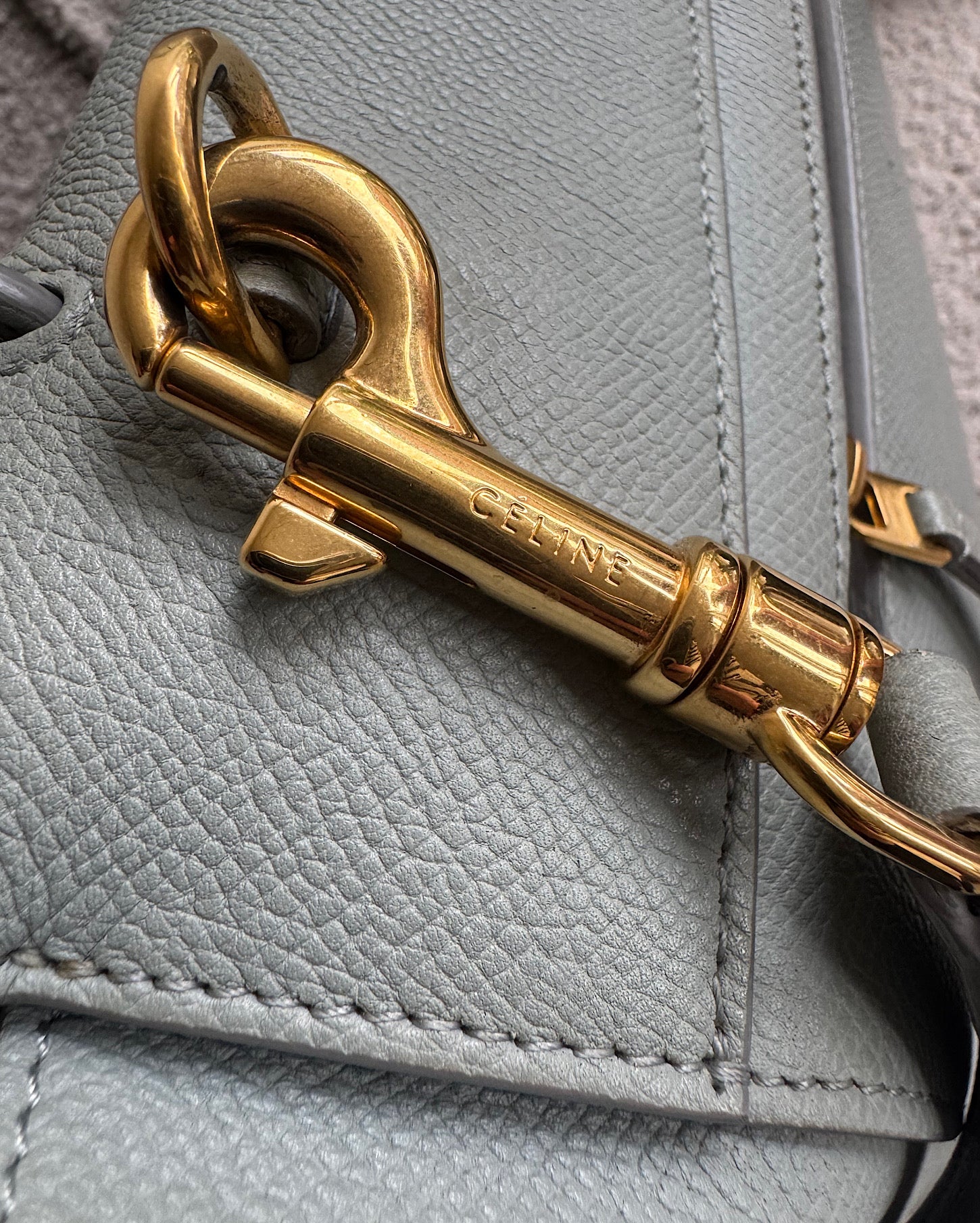 A stylish eggshell blue grained leather belt bag from Celine. The bag has been used and it is showing some signs of wear including a scratch on the flap. A style steal at £625! Comes with it’s dust bag. Features a removable shoulder strap, a back zip and gold metal studs on the base.