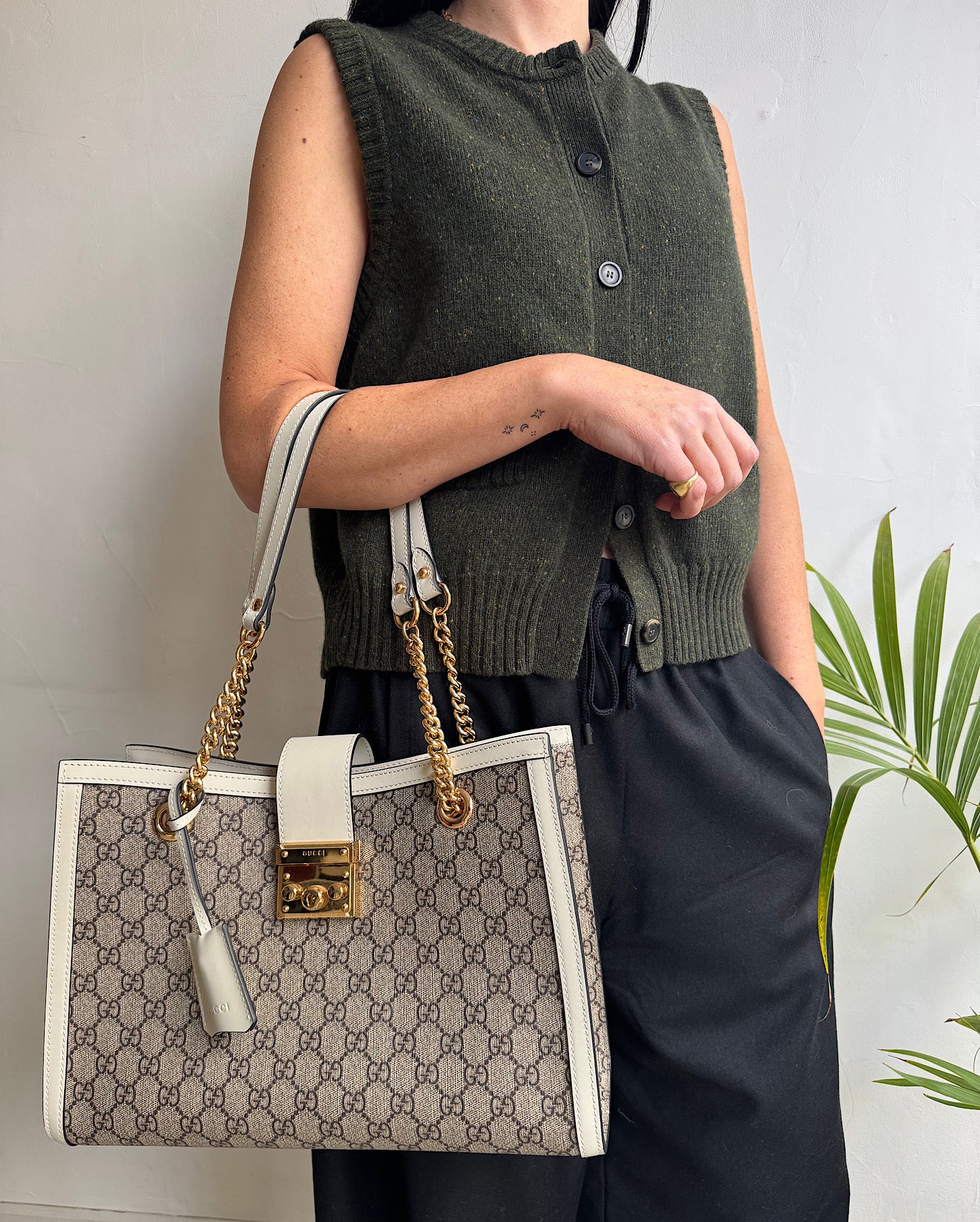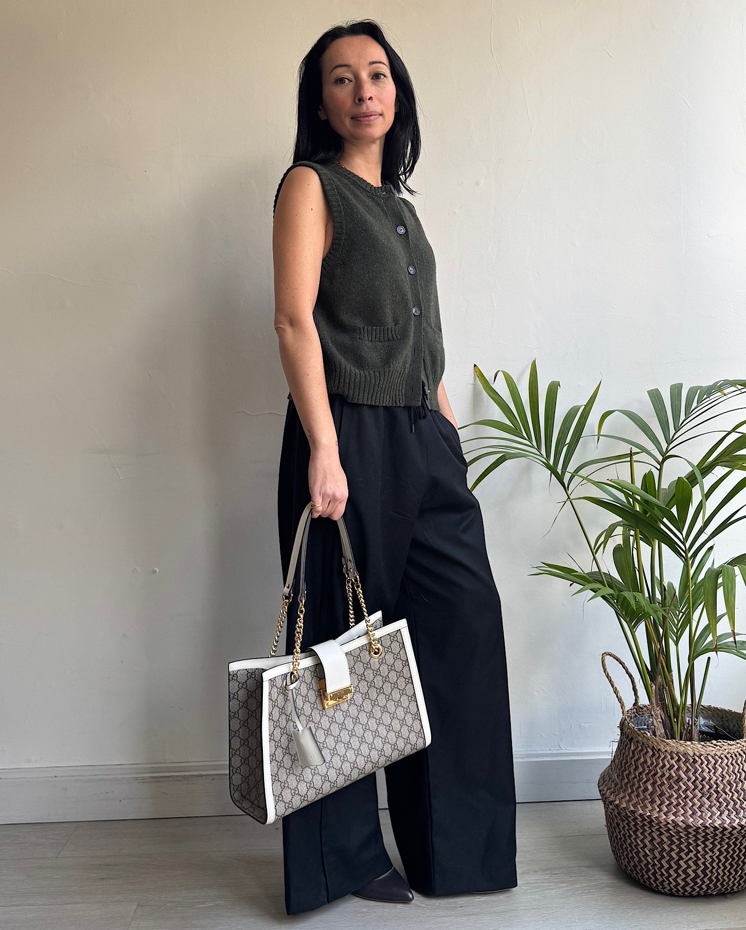 A stylish khaki Elm merino wool sleeveless vest by Bamford. Size small and a style steal at £160! Originally retailed at £335! Perfect to wear on it’s own with denim or tailoring or layered over a shirt or t shirt. Features button fastenings and front patch pockets.