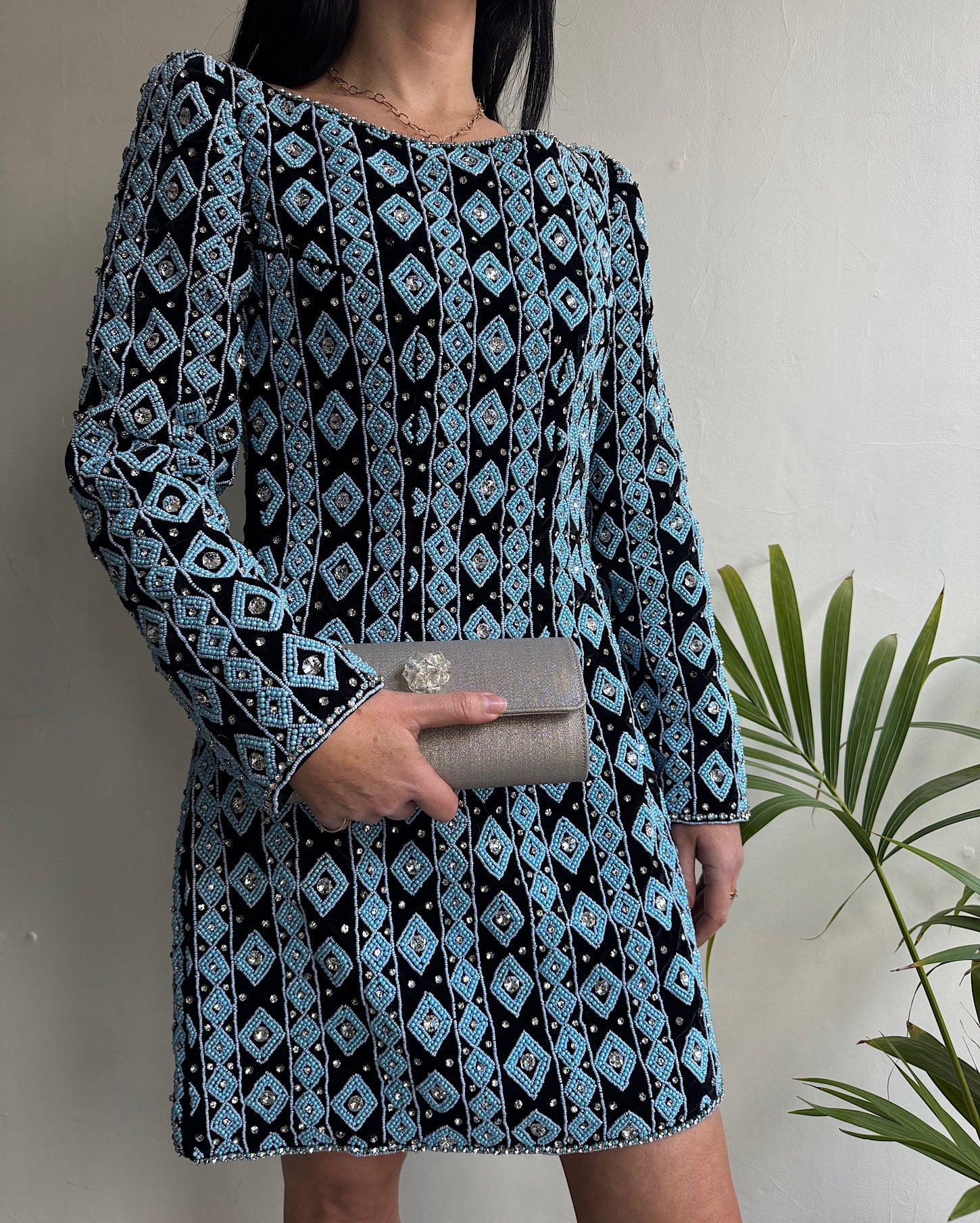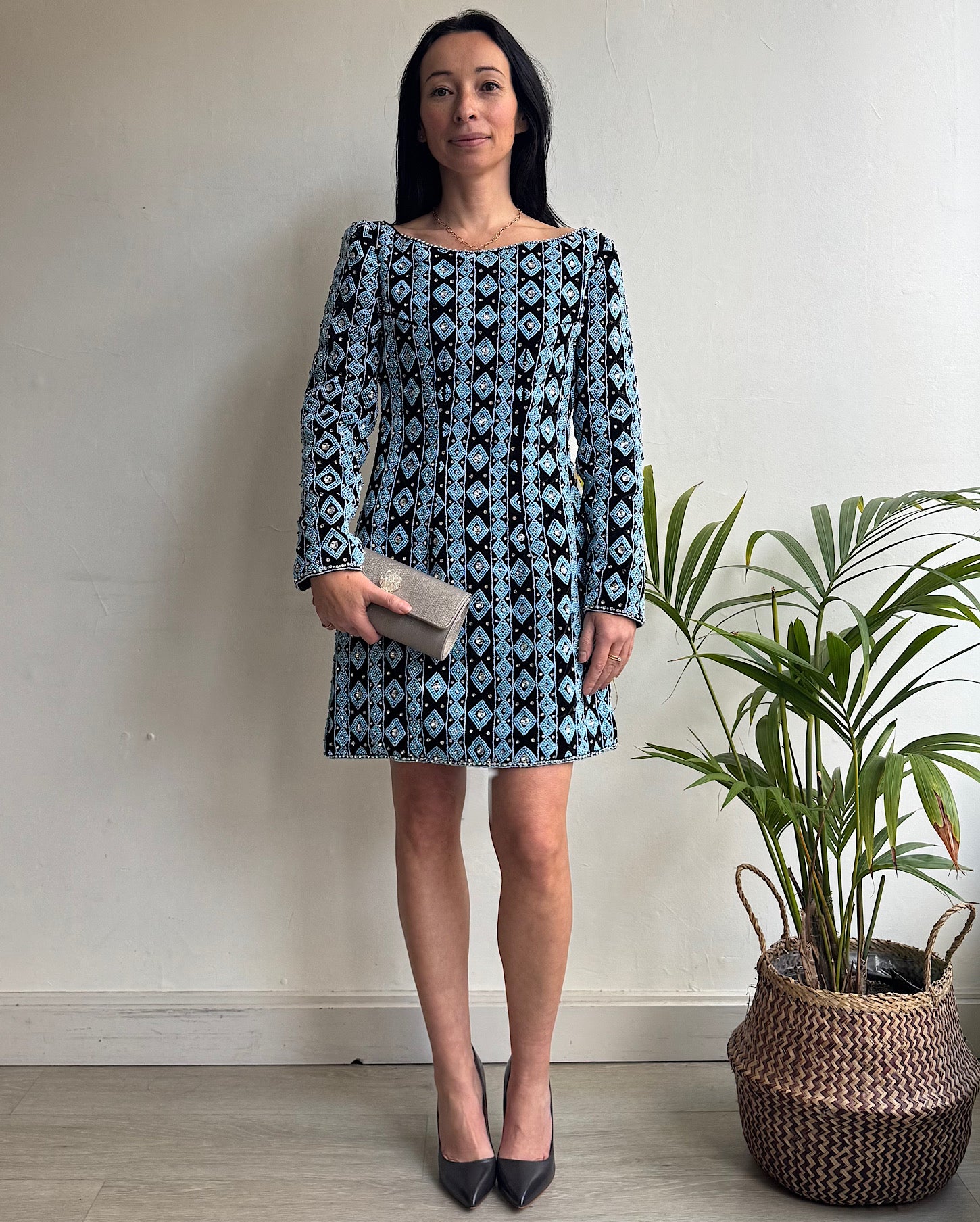 A stunning black velvet dress with blue and diamanté embellishment from House of RG. Size M / size 10, new with tags and a style steal at £295! Originally retailed at £1550! Features a slash neck, long sleeves and a concealed back zip.