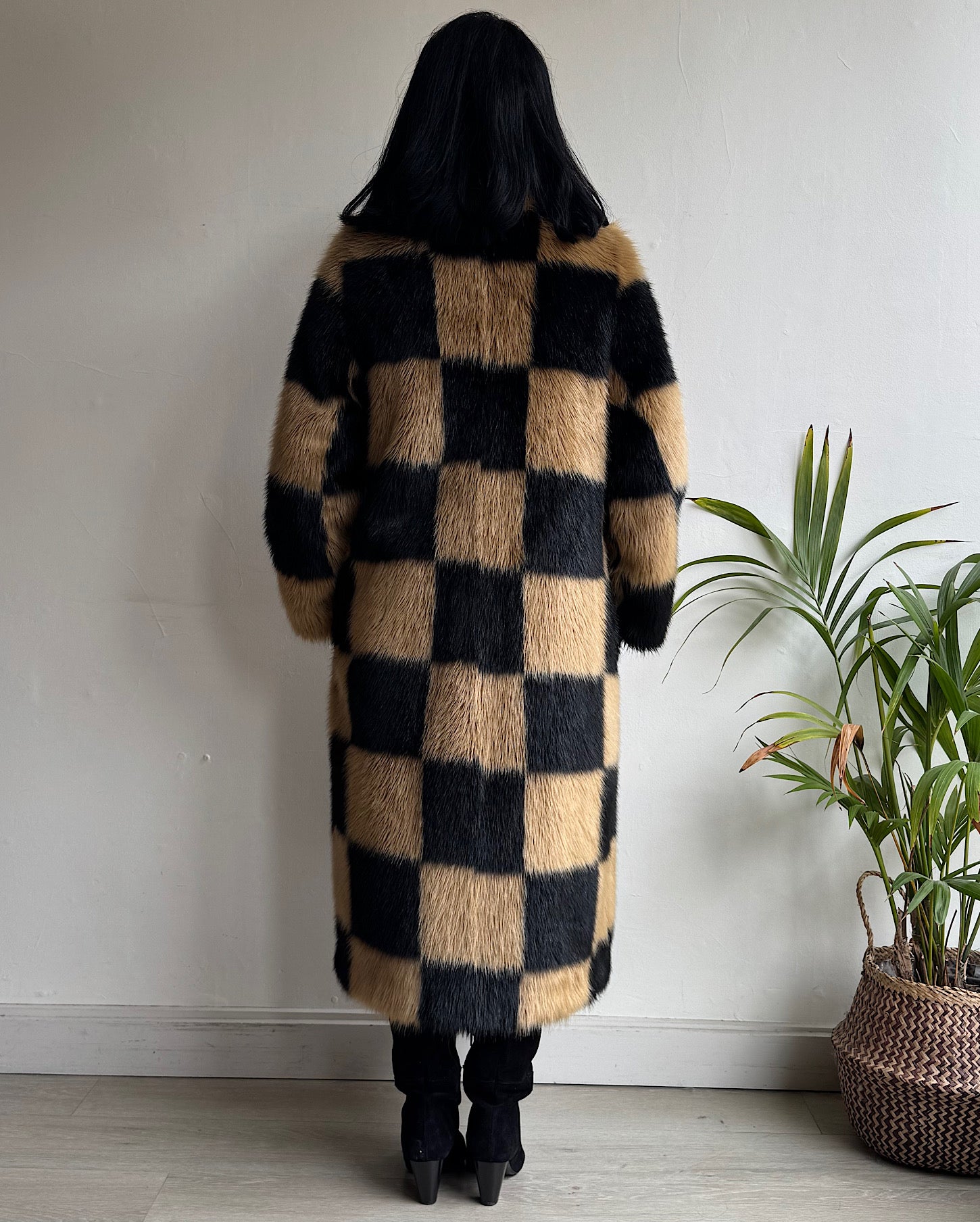 A stylish camel and black check faux fur “ Nino” coat by Stand Studio. Size 8 ad a style steal at £215! Features snap fastenings and pockets. The coat is fully lined and very soft and cosy.