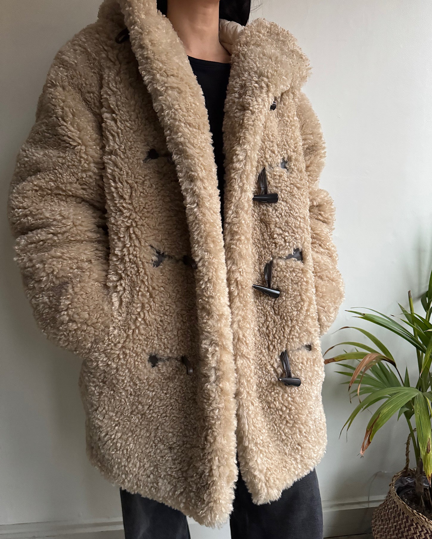 A stylish “Florene” faux shearling duffle coat by Isabel Marant. A generous size 36 FR / 8-10 UK and a style steal at £375! Features faux leather toggle fastenings, pockets and a hood. Looks great worn with denim and trainers or boots. Also looks great worn with leather.