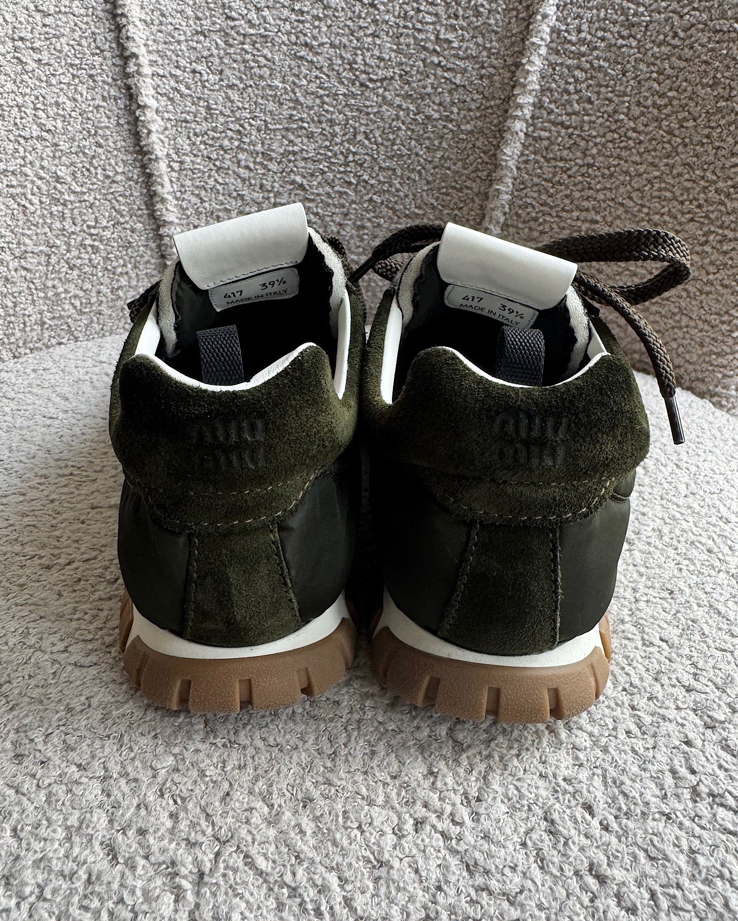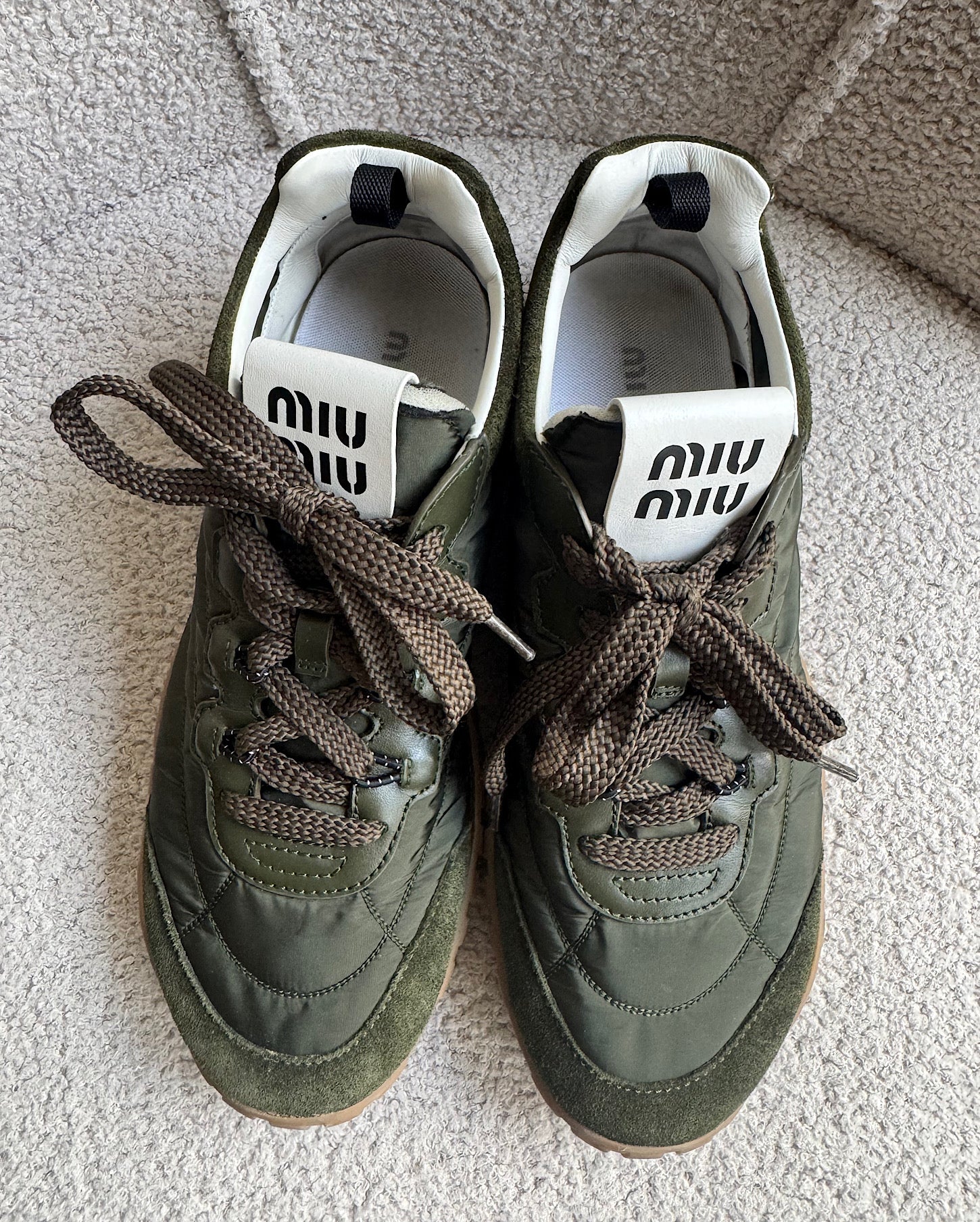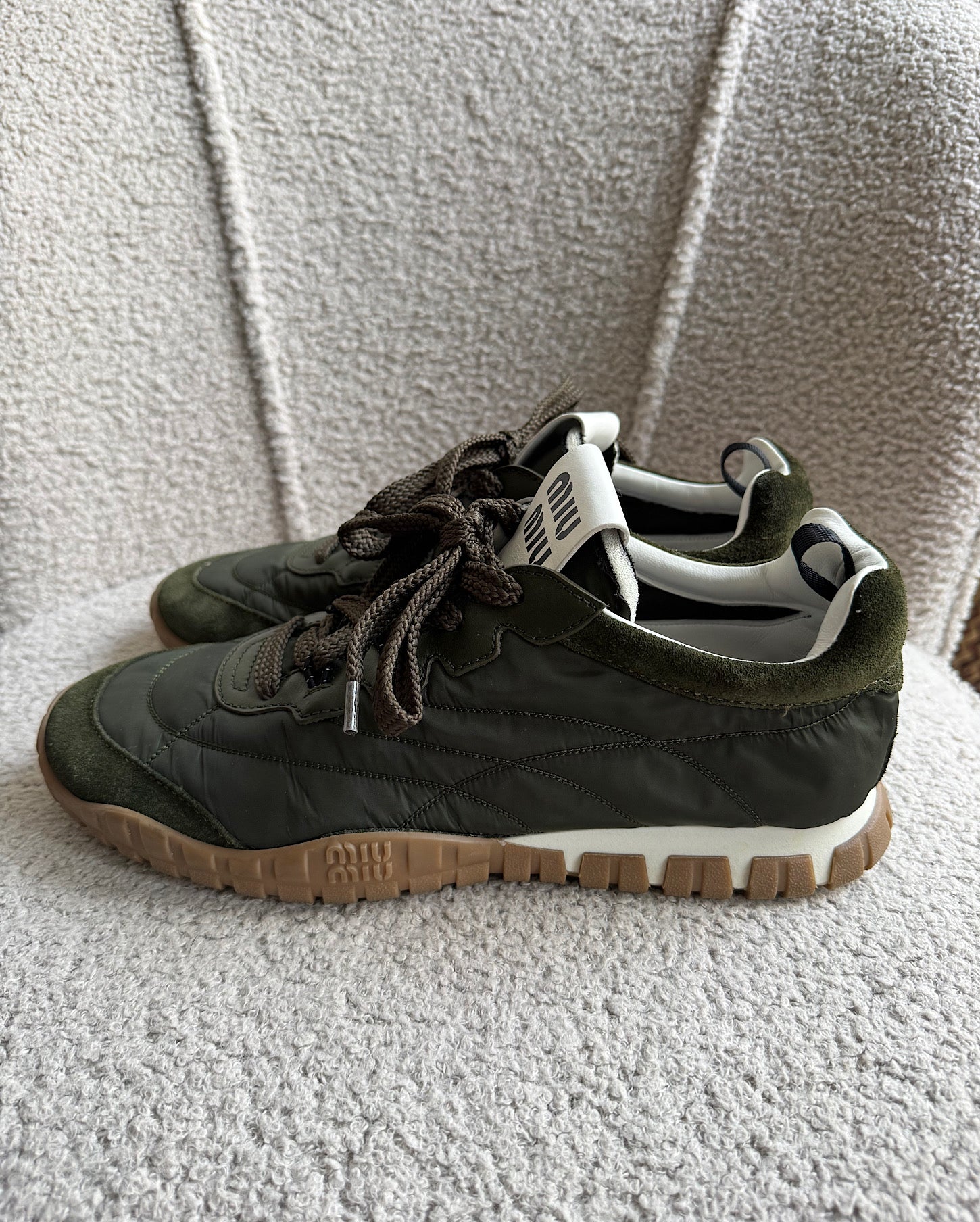 A very stylish pair of khaki neoprene and suede Tyre trainers from Miu Miu. Size 39.5 / 6.5 and a style steal at £595! Currently retailing at £820! They have only been worn a couple of times and they come boxed.