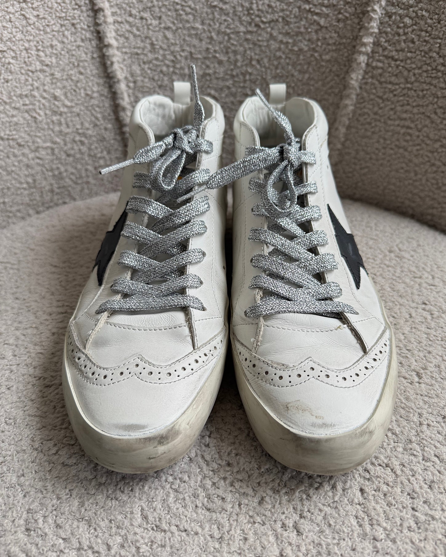A stylish pair of white, black and silver Mid Star Classic trainers from Golden Goose. Size 39 / 6 UK, only worn once and a style steal at £195! The trainers come boxed. Currently retailing at £470!