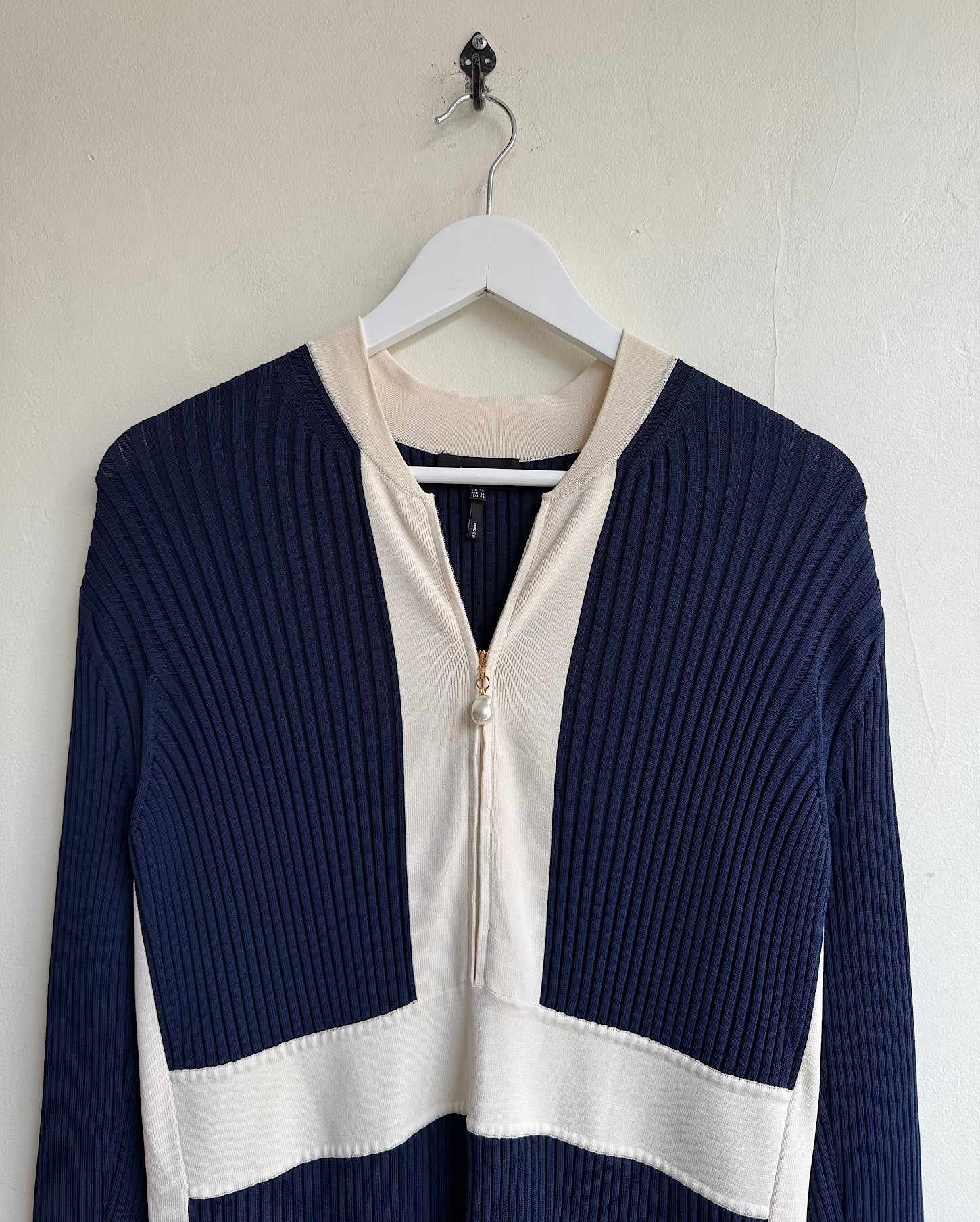 A stylish navy and white ribbed dress by Me and Em. Size 16 and a style steal at £175! Features a zip fastening on the front down to the waistband and a pearl feature on the zip.