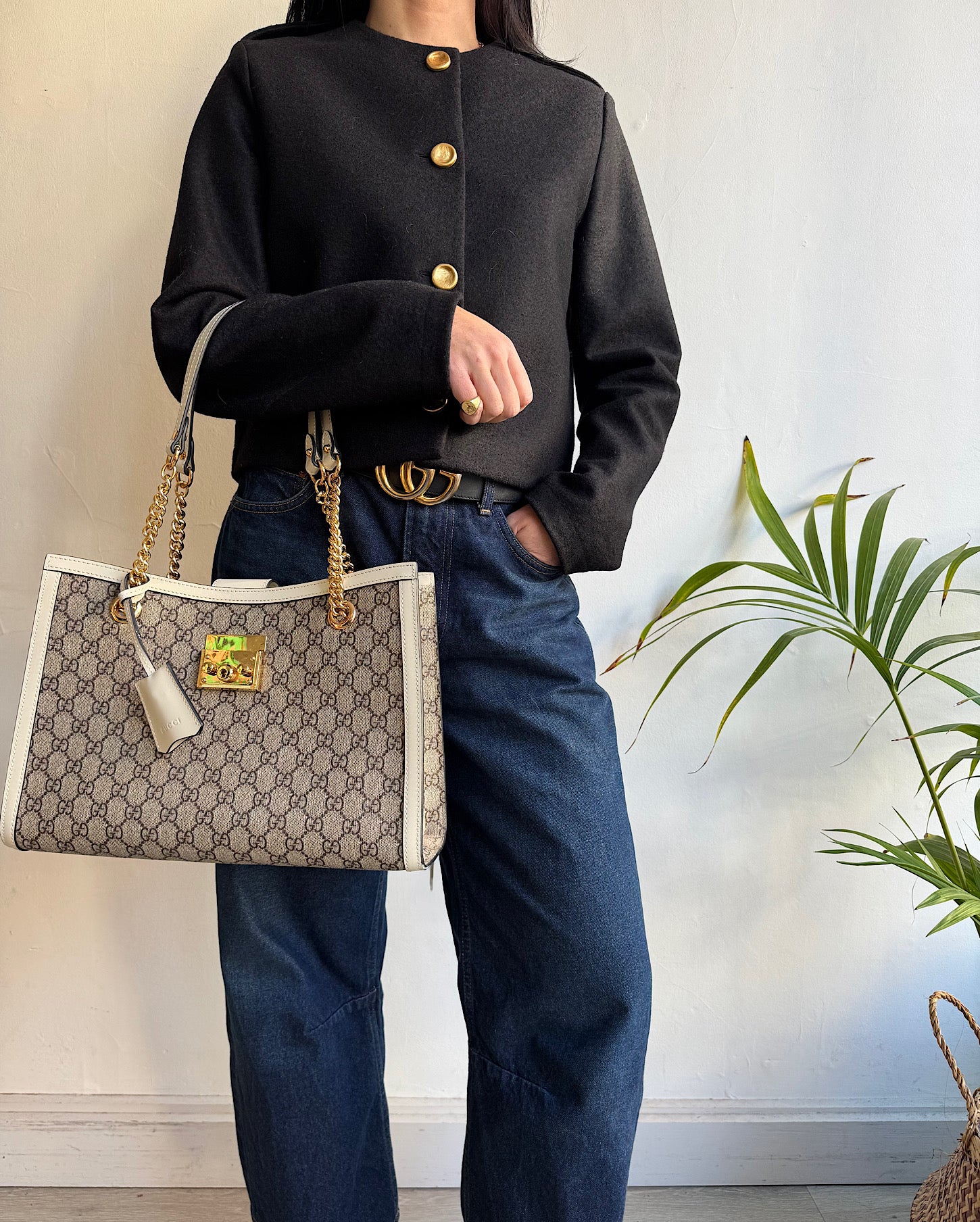 A stylish black cropped wool jacket with statement gold button fastenings from Harris Wharf. Size 40 IT / 8 UK, new with tags and a style steal at £195! Currently retailing at £400 in Selfridges. Features a round neck, long sleeves and pressed wool texture.