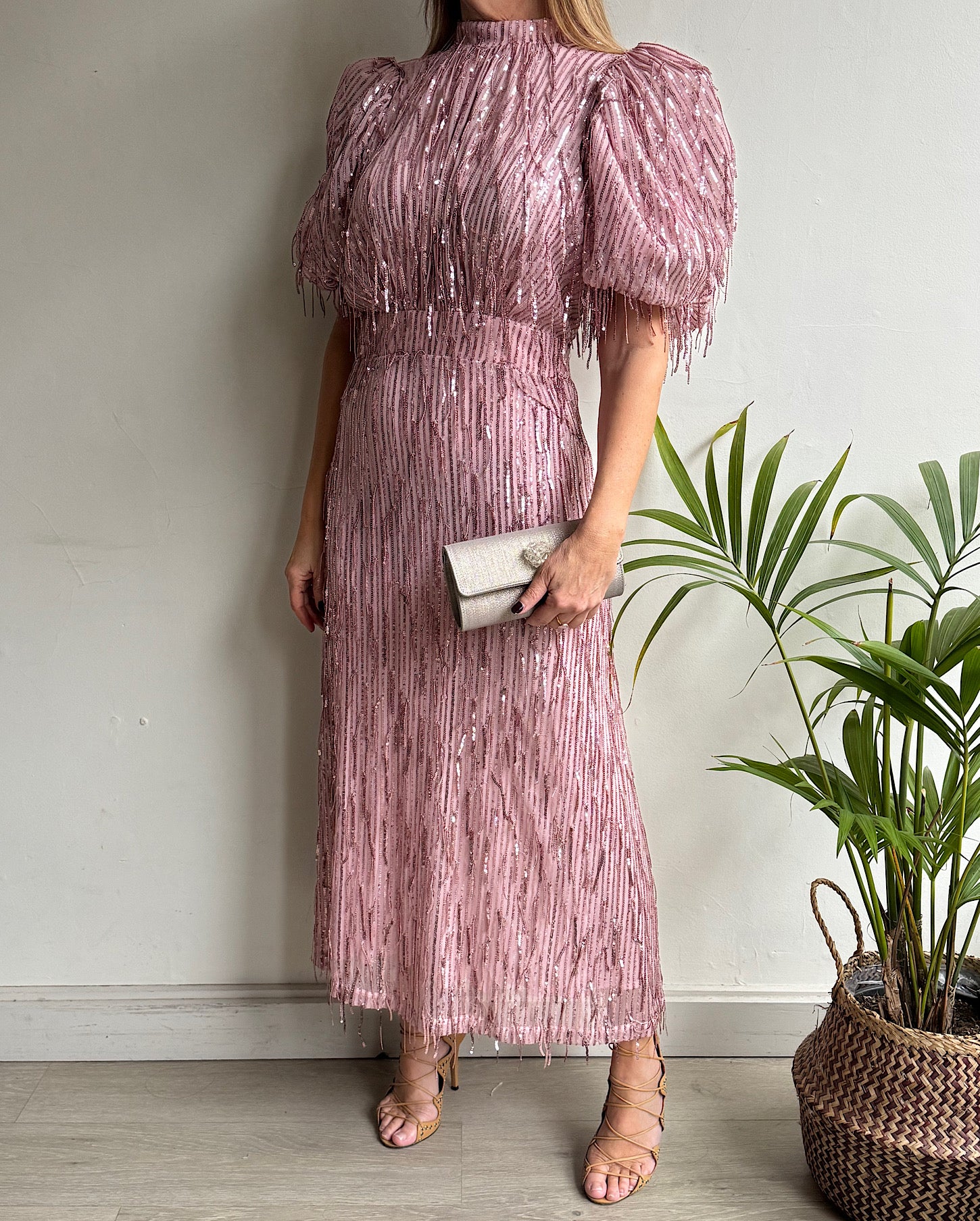 A stunning rose pink sequin dress by Rotate. Size 12 and a style steal at £165! Features a cut out back with two ties and statement puff sleeves.
