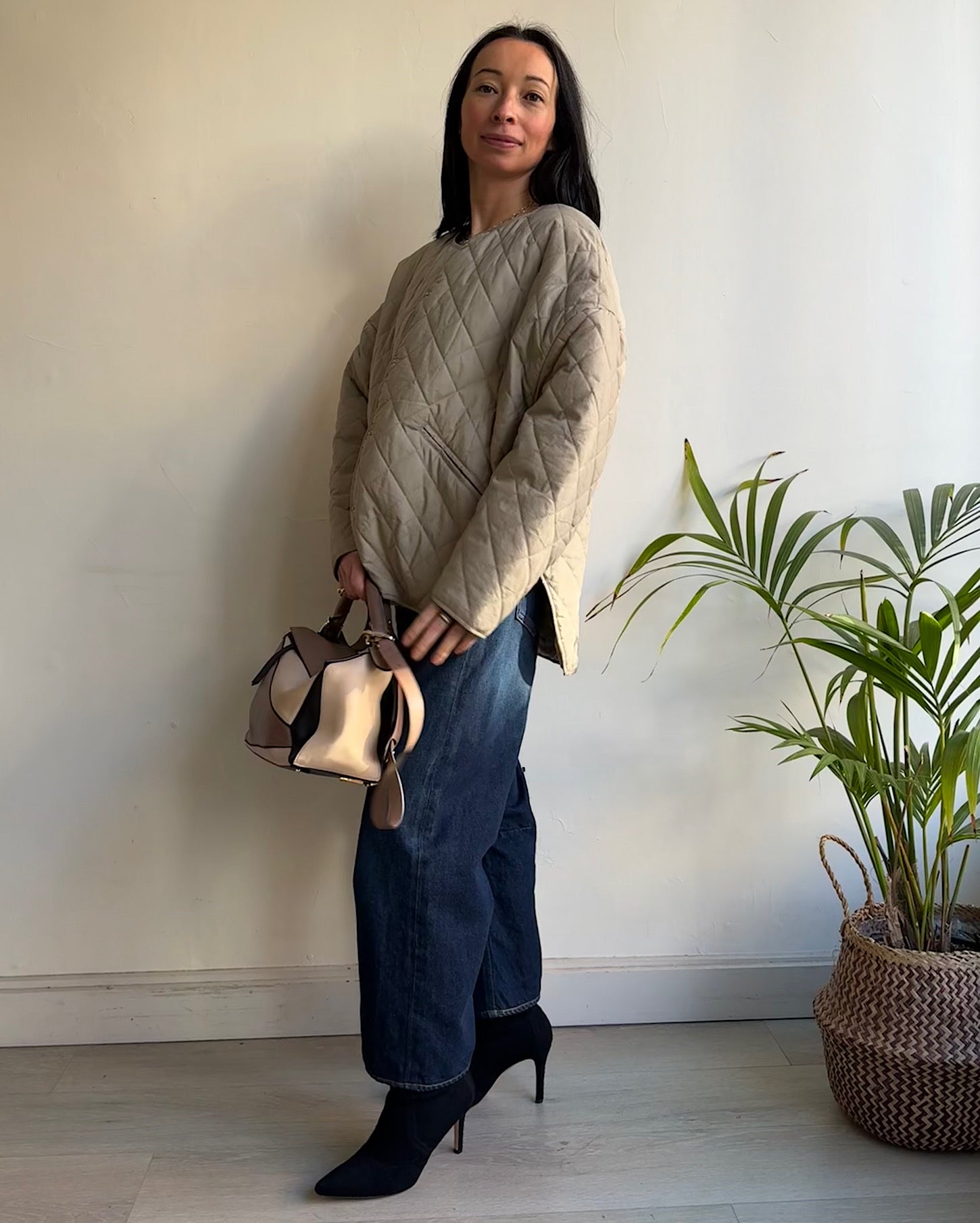 A stylish sage quilted jacket from Toteme. Size 36 FR / 8-10 UK and a style steal at £265! Retailed at £465 originally. The jacket is collarless and features popper fastenings, pockets and a curved hemline.