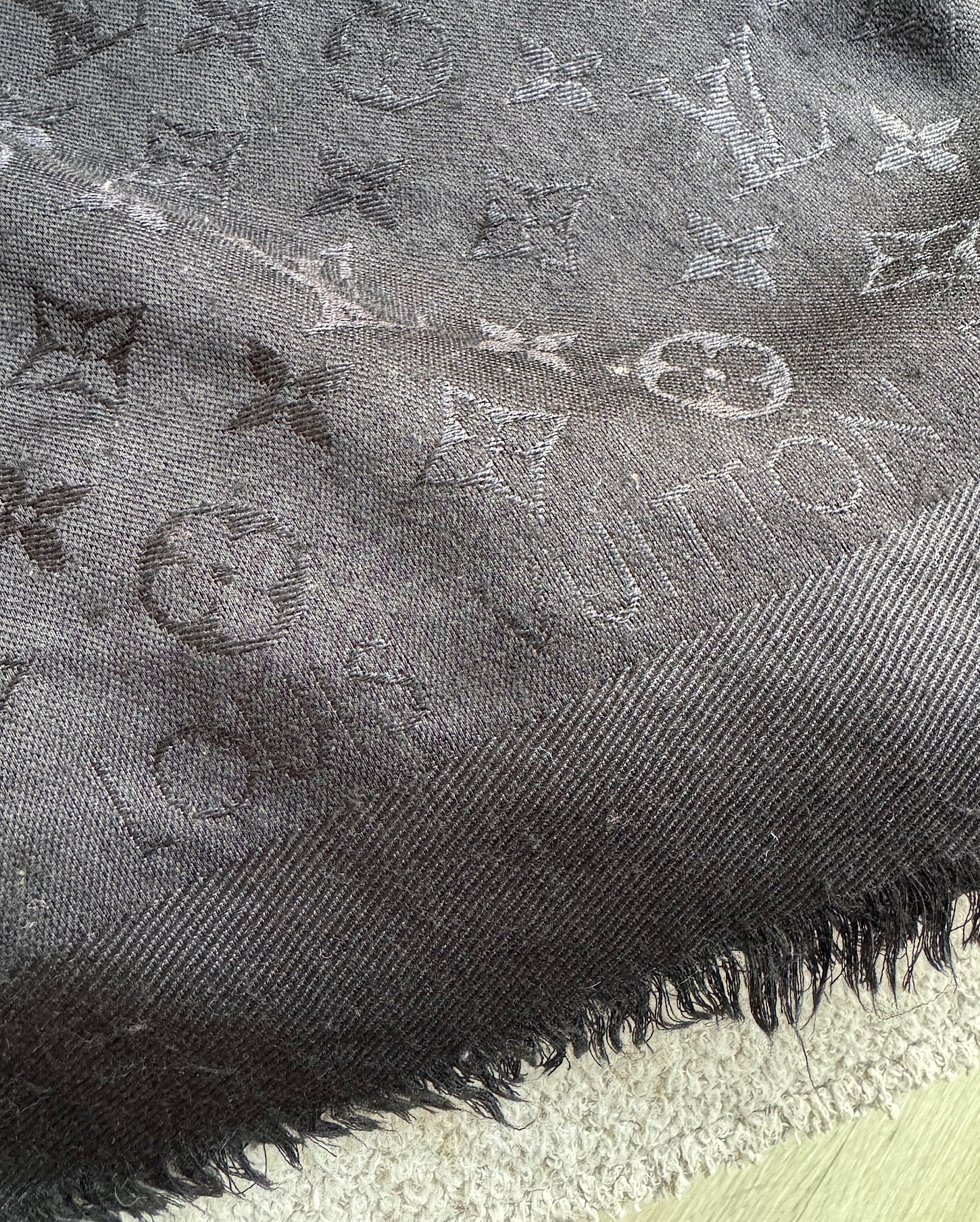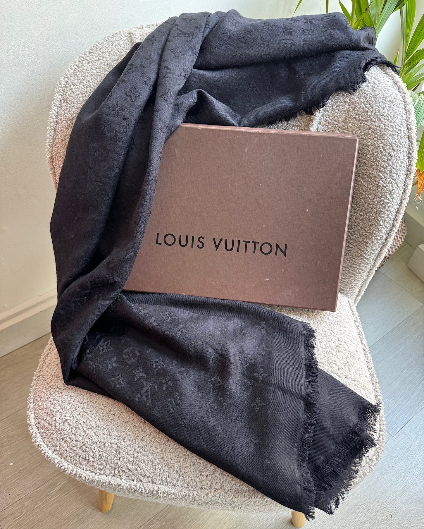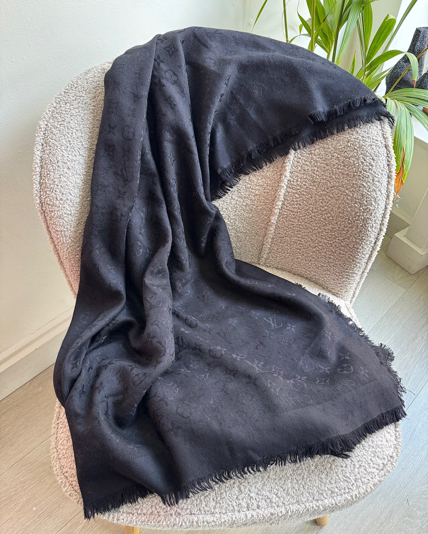 A lovely classic black silk and wool scarf from Louis Vuitton. Measures 142 cm by 142 cm and comes boxed. A style steal at £245! Features a frayed edge.