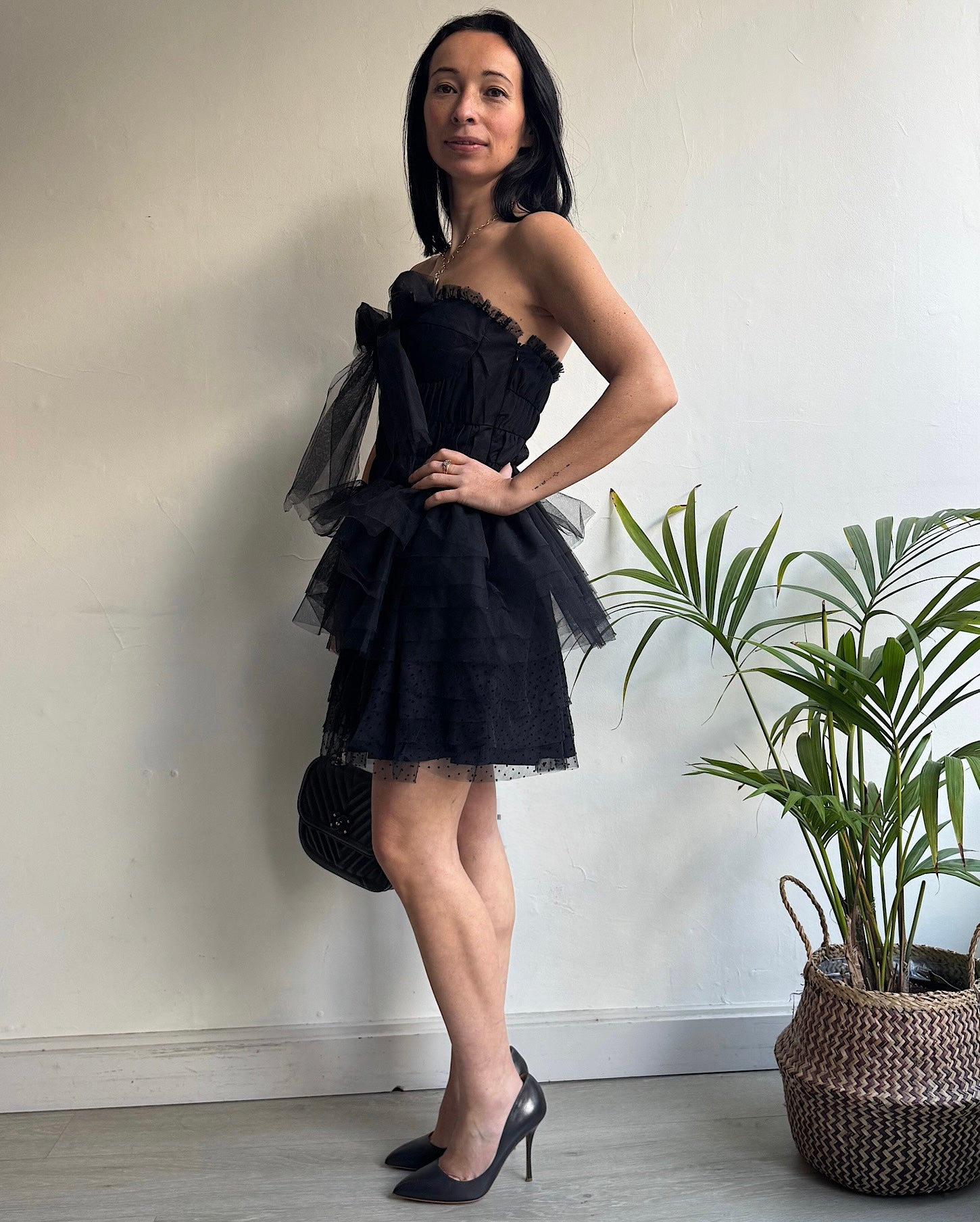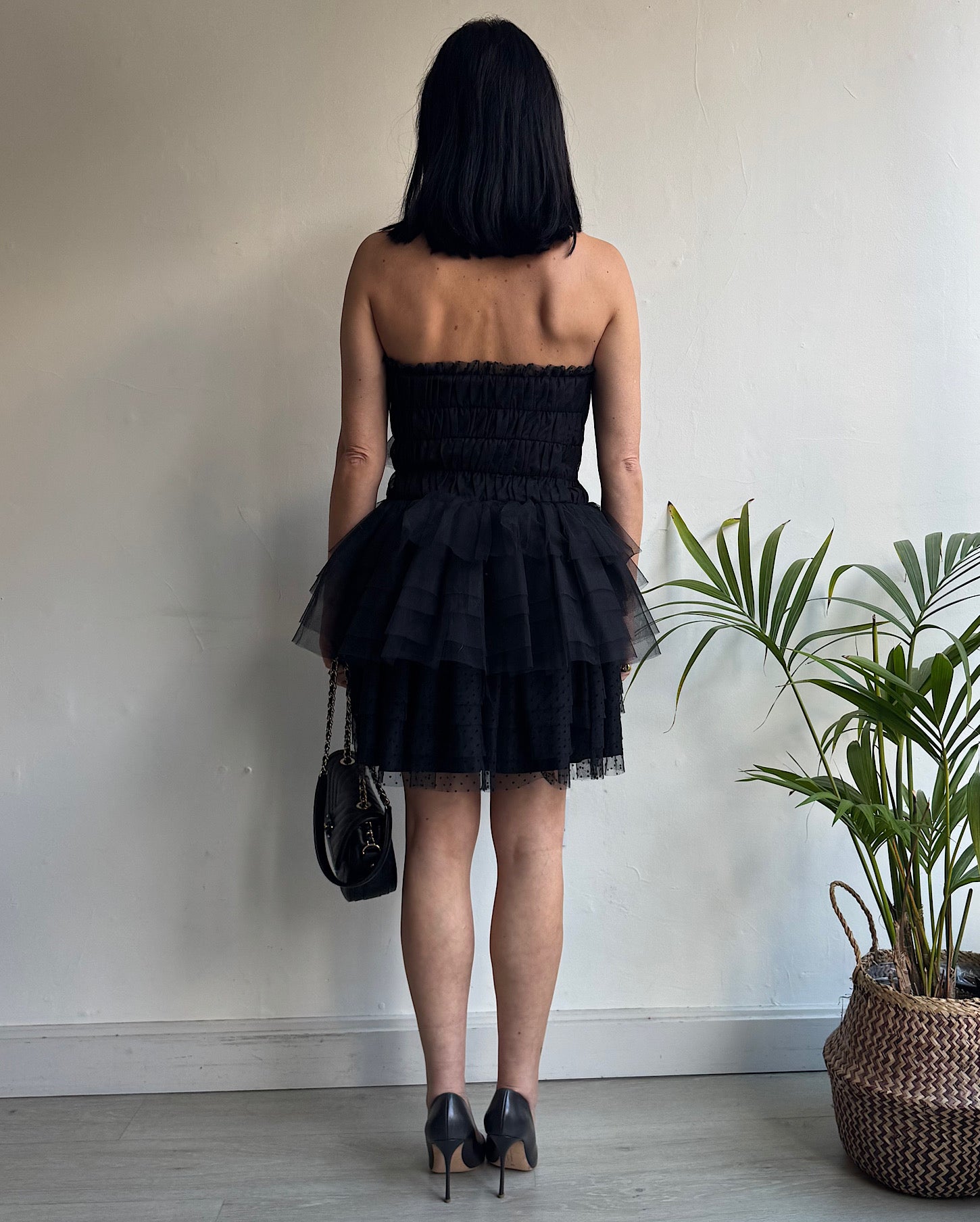 A striking black strapless mini dress from Love Shack Fancy. Size 8 and a style steal at £150! Features a concealed side zip.