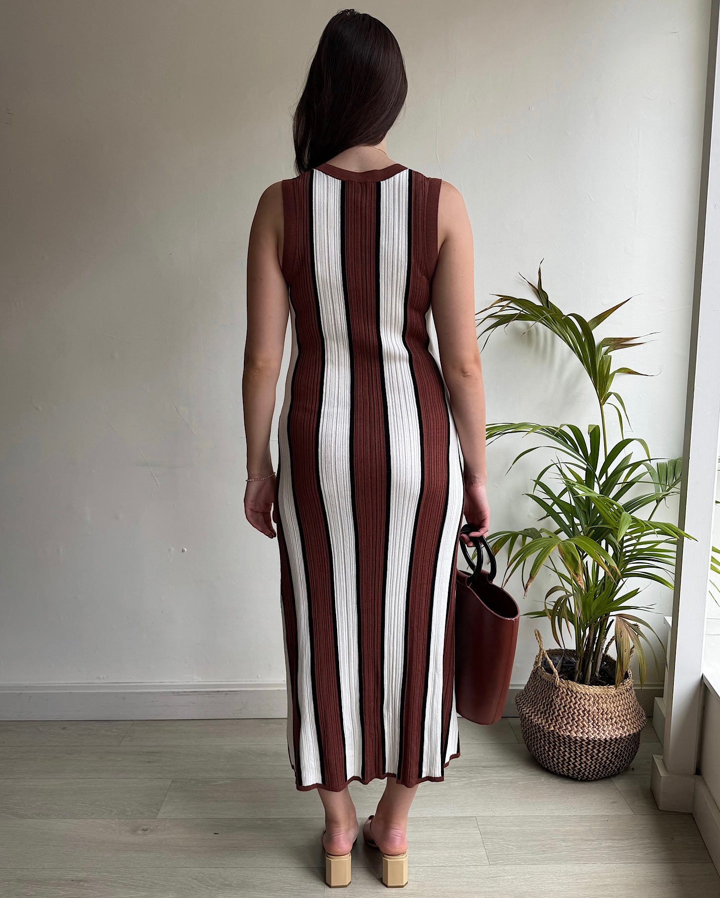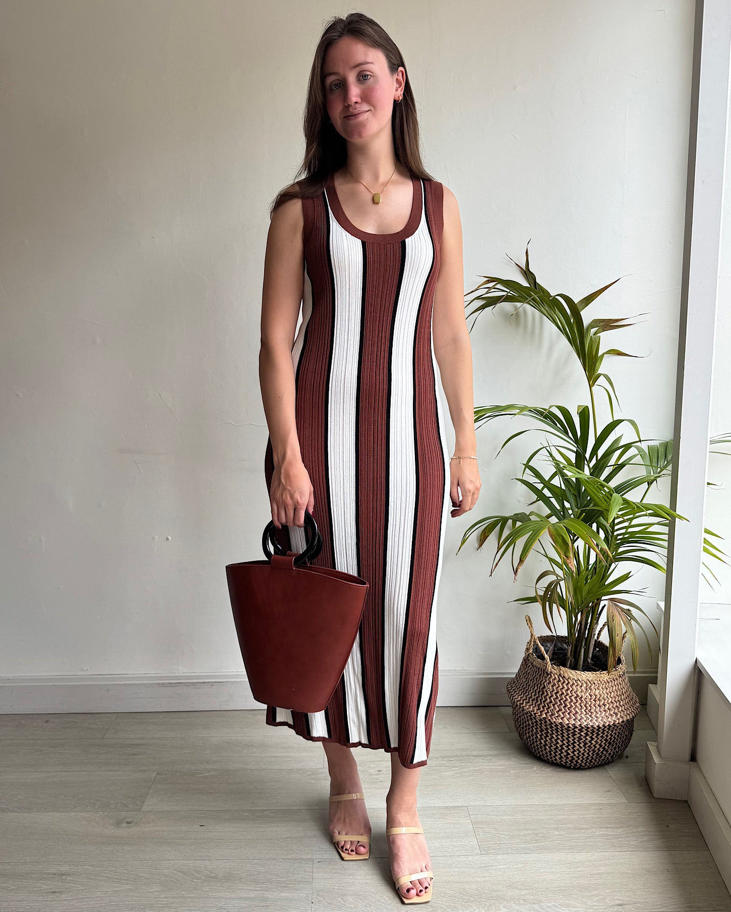 A striking white, chestnut brown and black striped ribbed dress by Joseph. Size small, new with tags and a style steal at £145! Perfect for the summer. Wear with sandals or dress up with heeled sandals. In the autumn, wear with boots and a jacket.