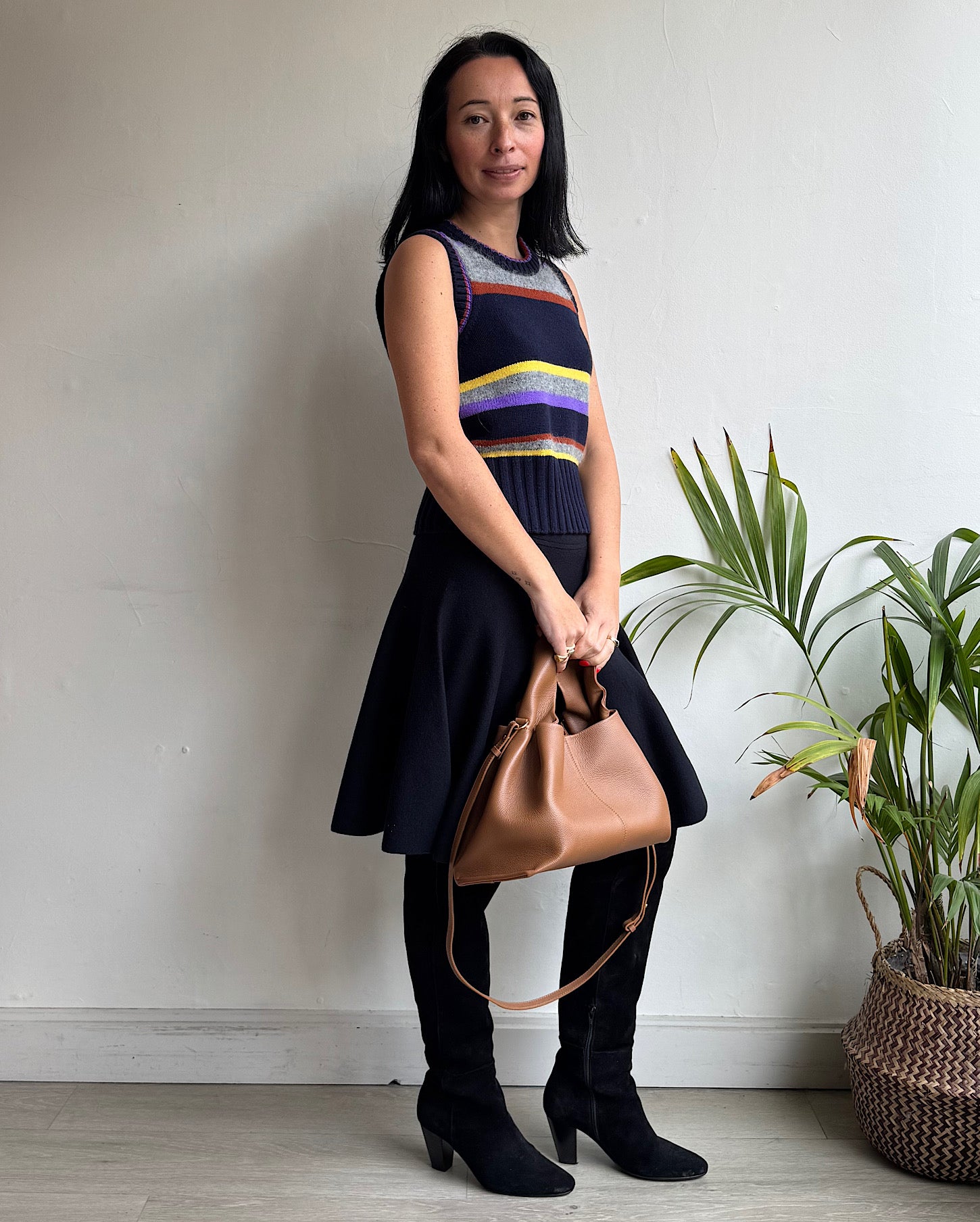 A stylish little sleeveless multi-stripe tank with detachable cowl neck by Me and Em. Size XS, new with tags and a style steal at £115! Super versatile. Style with denim or more tailored pieces. Looks lovely worn on its own, with or without the collar and also layered over a shirt, fine knit or long sleeved dress.
