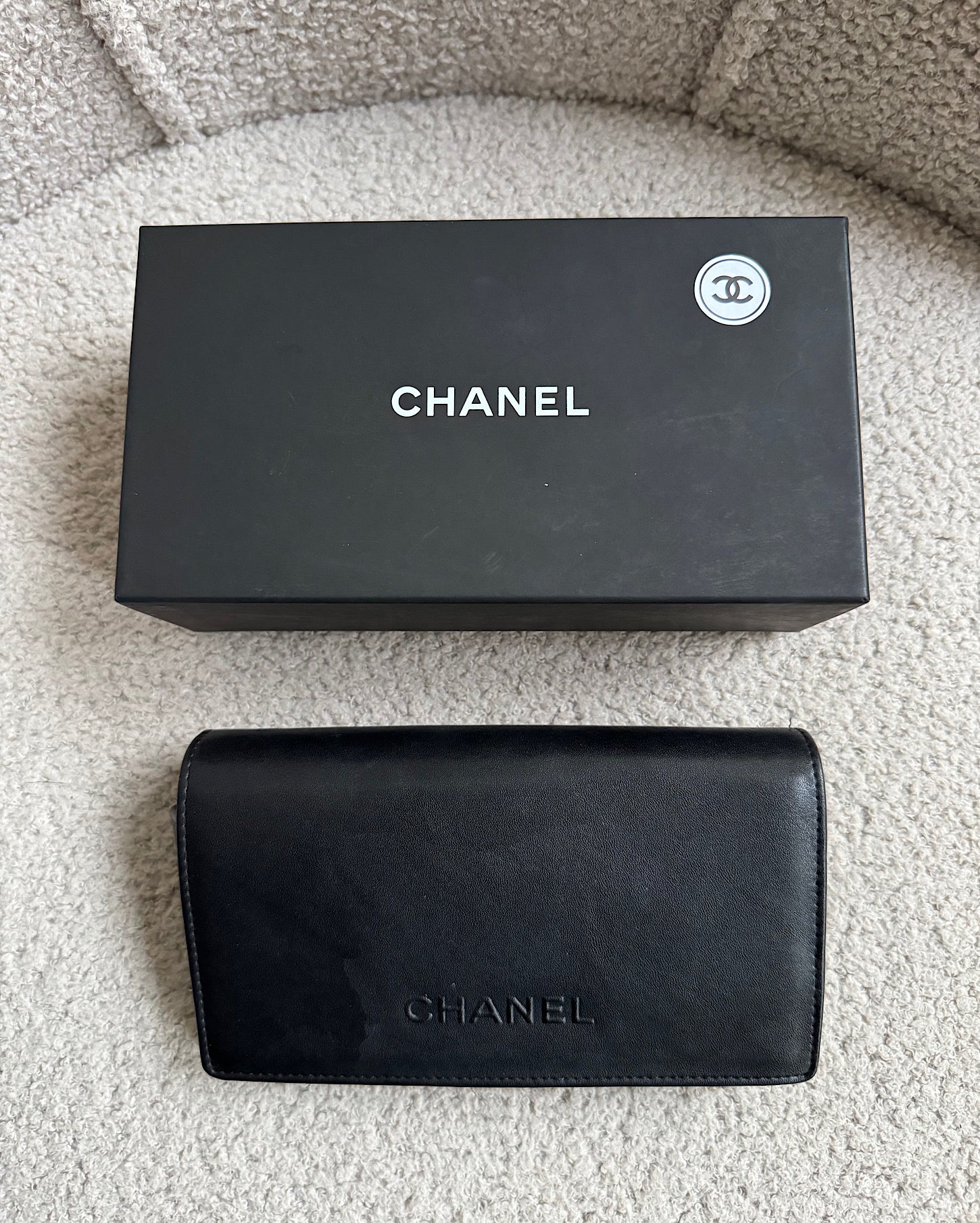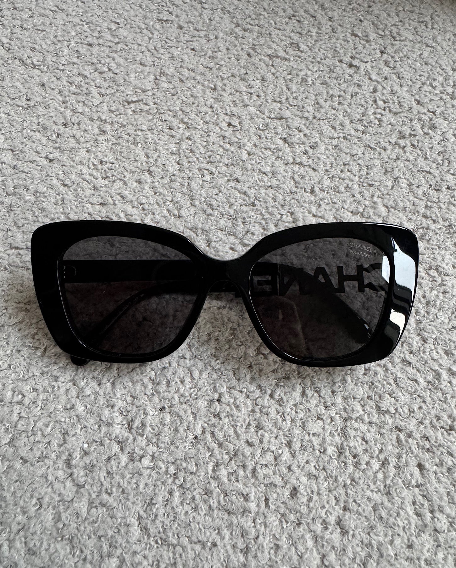 A stylish pair of black Chanel sunglasses which come with their case and box. They are in great condition and they are a style steal at £265! They feature a statement black diamanté Chanel lettering on one of the arms.