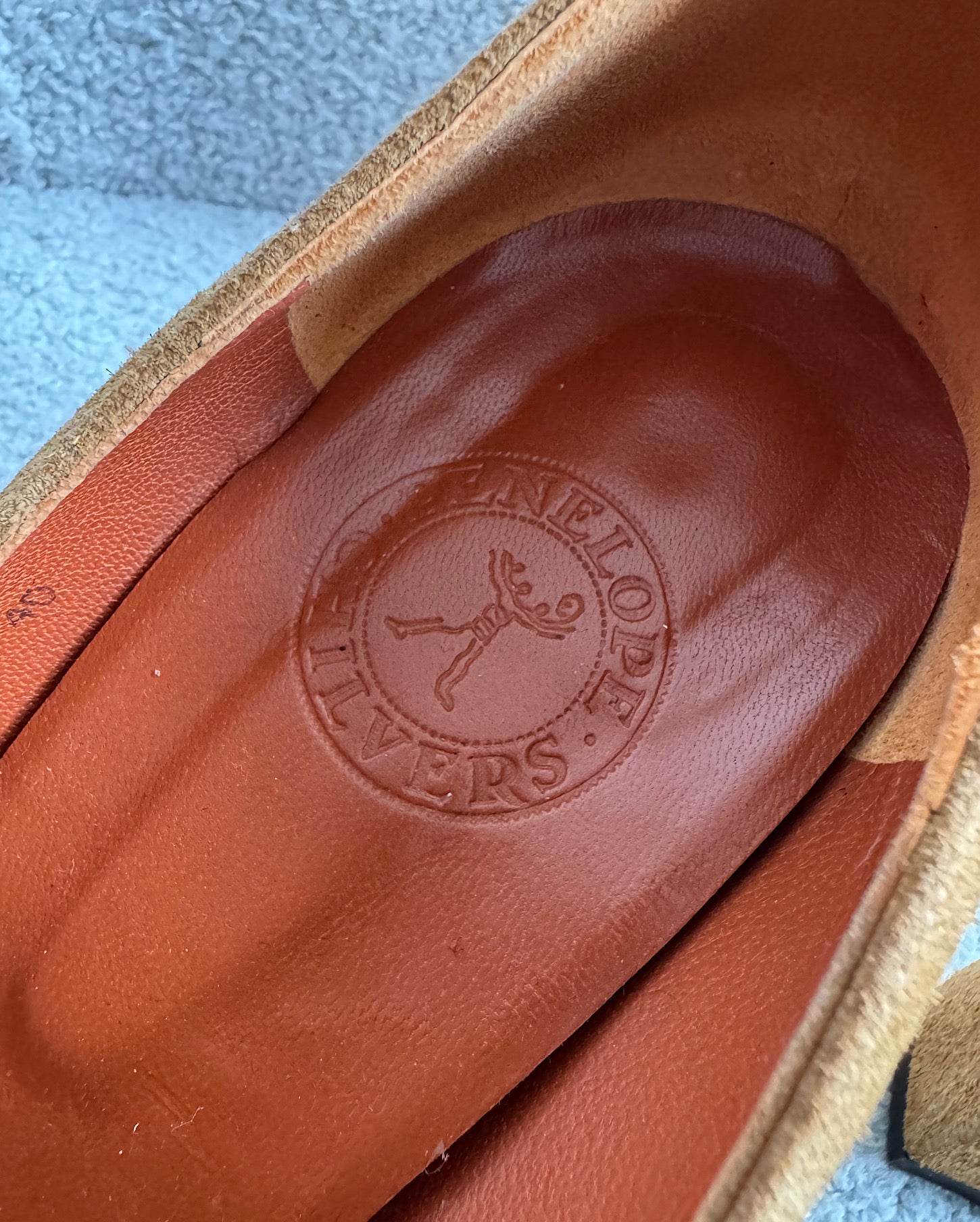 A stylish pair of tan suede heeled shoes by Penelope Chilvers. They are a size 40 / 7 and a style steal at £125! They feature a fringing and colourful tassels. They are in good preloved condition and come unboxed.