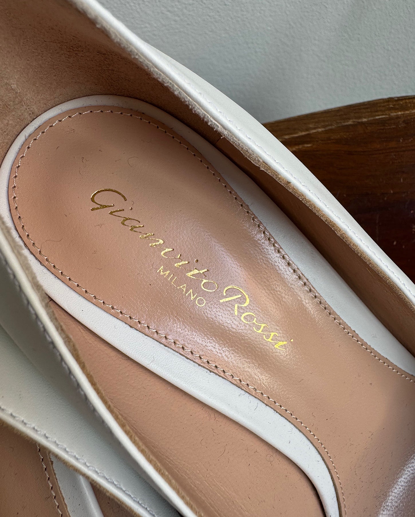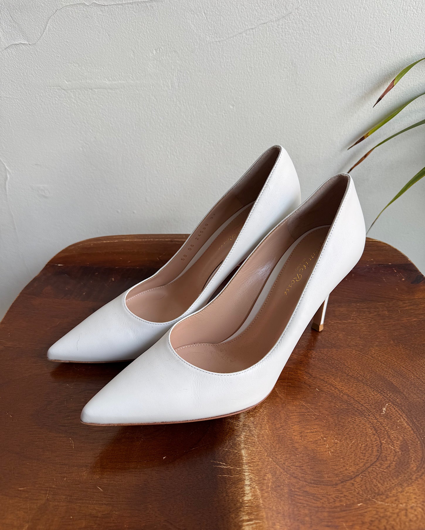 A gorgeous pair of white leather heels from Gianvito Rossi. Size 37 / 4 UK but on the small side and fits more like a 3.5 UK. The shoes are new and have only been tried on in the shop. They come boxed.