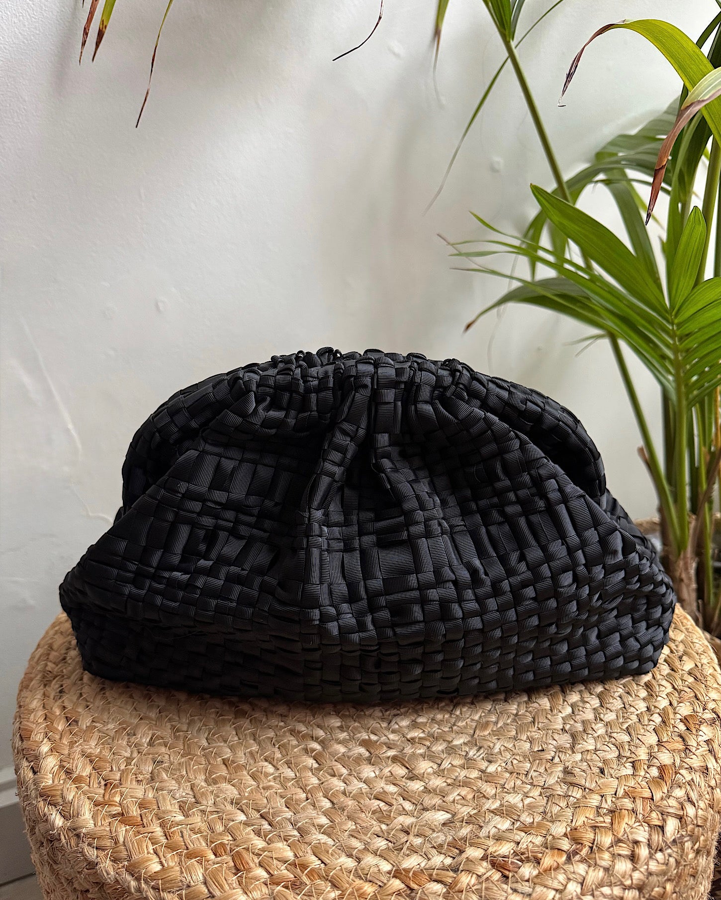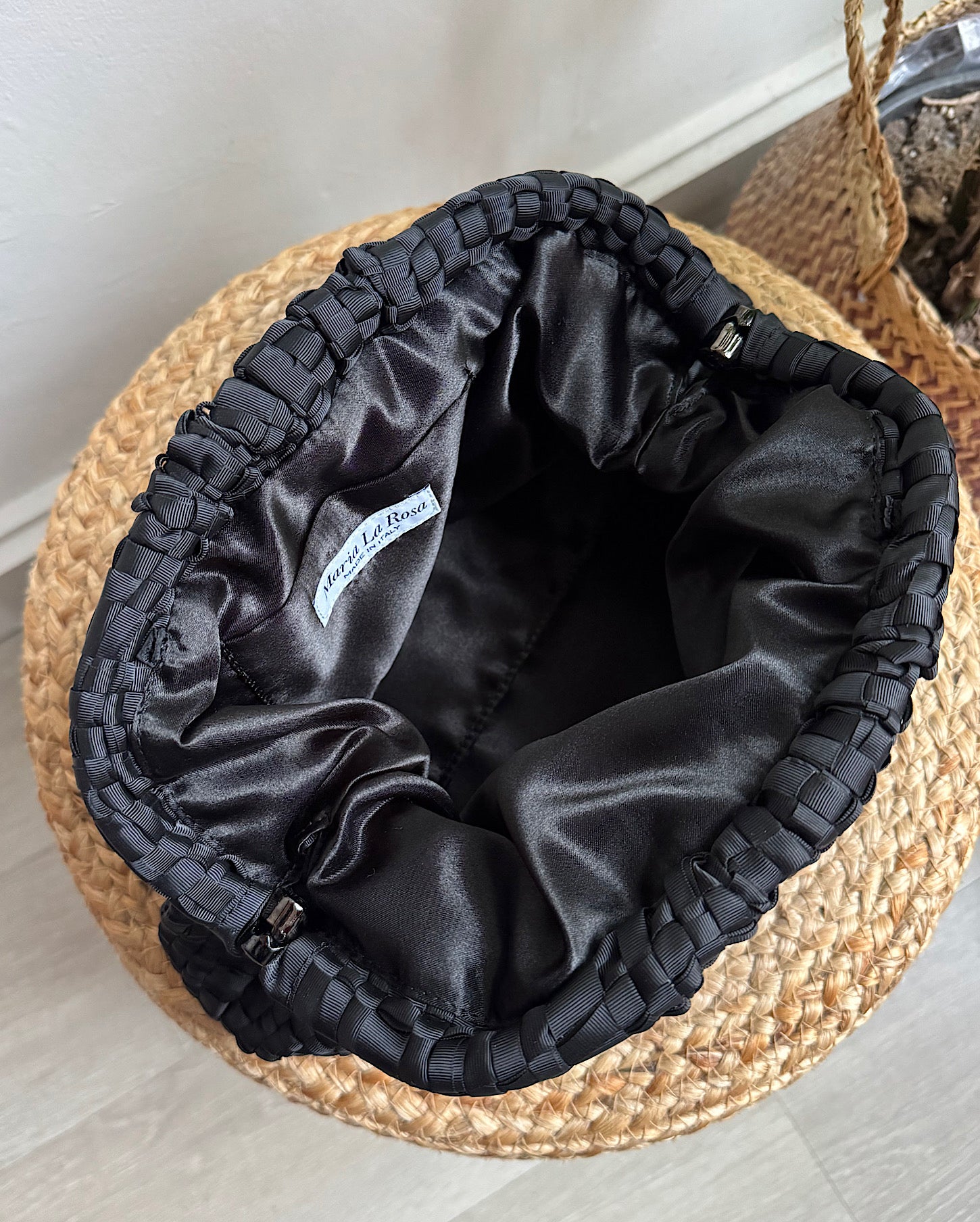 A beautiful black grosgrain ribbon woven cloth bag from Maria La Rosa. Only used a couple of times and in excellent condition. A style steal at £165! Measures 31cm W x 8 cm D x 19cm H.